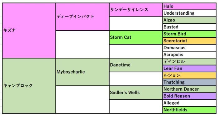 一方で、当駒キャンプロックはデビューから1年も満たずに3勝を記録。ディープの孫系統で急に強くなったのは、父父ディープや母父Myboycharlieの影響ではないと考えられる。残されたのは父母・母母の系統である。ここに目を向けたい。