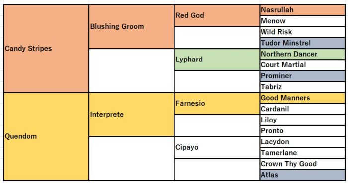 アクロフェイズの牝系に居るCandy Stripes>Red Godは2000年代の頃から私は良質の持久力遺伝を持っていると言い続けてきた。Candy Stripesの母バブルカンパニーからは天皇賞馬バブルカンパニー、あるいは孫世代に菊花賞馬ザッツザプレンティなどが居て瞬発力勝負よりも持久力とスタミナで粘りこむような走法を得意としている。パワーが弱めで気性が難しい牝馬では良さが出ない血統なのかもしれない。